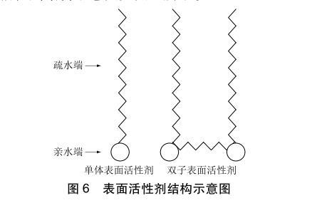 從圖3中可以看出加入表面活性劑S1、S2能降低漿液的表面張力和接觸角。這是因為本次漿液改性選用的表面活性劑S1、S2從化學(xué)結(jié)構(gòu)上屬于雙子型非離子表面活性劑。傳統(tǒng)表面活性劑和雙子型表面活性劑結(jié)構(gòu)示意圖如圖6所示。