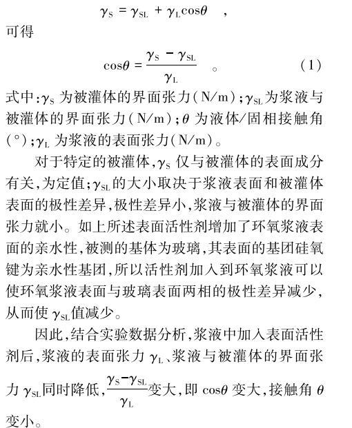 對于特定的被灌體,γS僅與被灌體的表面成分有關(guān),為定值;γSL的大小取決于漿液表面和被灌體表面的極性差異,極性差異小,漿液與被灌體的界面張力就小。如上所述表面活性劑增加了環(huán)氧漿液表面的親水性,被測的基體為玻璃,其表面的基團(tuán)硅氧鍵為親水性基團(tuán),所以活性劑加入到環(huán)氧漿液可以使環(huán)氧漿液表面與玻璃表面兩相的極性差異減少,從而使γSL值減少。