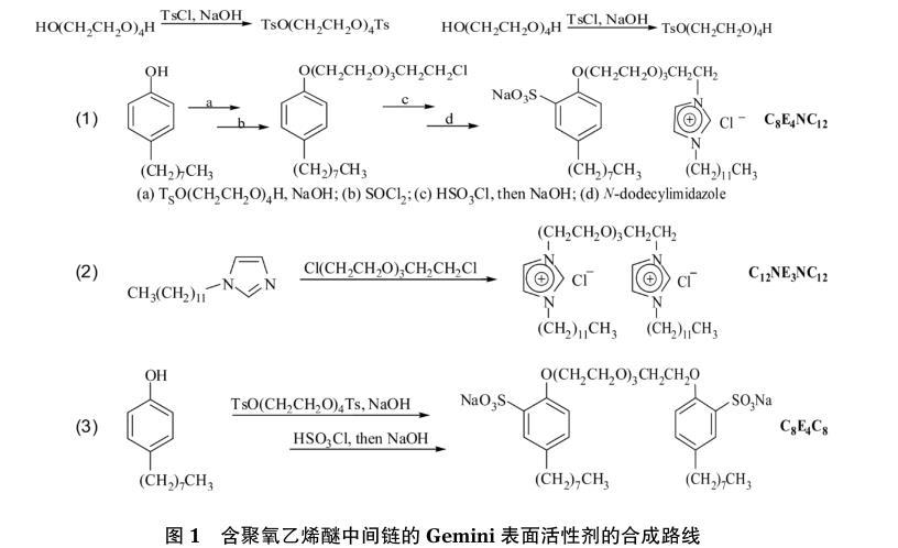 Gemini表面活性劑是具有雙親水雙親油特殊結(jié)構(gòu)的一類表面活性劑,因其結(jié)構(gòu)的特殊性和分子結(jié)構(gòu)設(shè)計的多樣性,使其在性質(zhì)和應(yīng)用方面有別于其他表面活性劑,具有表面活性更高,臨界膠束濃度(cmc)更低等特點。