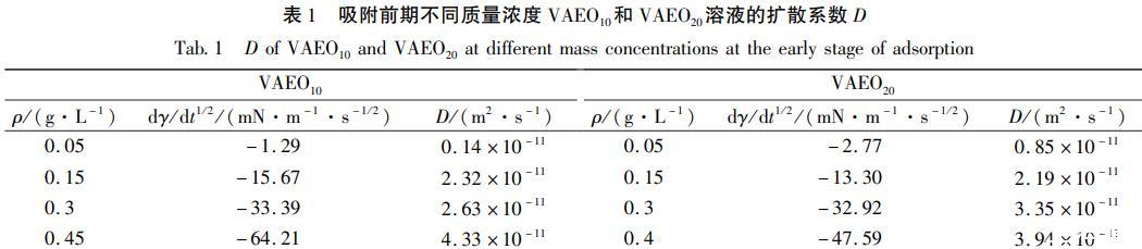 分析表1數(shù)據(jù):在VAEO溶液質(zhì)量濃度小于cmc時,吸附前期擴散系數(shù)D隨質(zhì)量濃度增大而增大,說明擴散系數(shù)D與質(zhì)量濃度有關(guān)。擴散系數(shù)D隨濃度增大的情況,有研究認為,可能的原因是隨著溶液質(zhì)量濃度增大,游離表面活性劑與水分子結(jié)合的乙氧基鏈段構(gòu)型發(fā)生變化,在擴散過程中表面活性劑與水之間的作用力減弱,同時擴散過程中靠近表面活性劑的水分子附近應(yīng)力場發(fā)生畸變,易形成空位和活化能降低,有利于后面表面活性劑的擴散,這種狀況在游離的表面活性劑分子濃度達到頂峰時,即cmc附近最為顯著,之后由于膠束的形成,會在一定程度上破壞這種行為,導(dǎo)致擴散速率降低。當(dāng)質(zhì)量濃度大于cmc時,短時間內(nèi),表面張力下降到很低的數(shù)值(見圖2),說明短時間內(nèi)表面層已經(jīng)吸附一定量溶質(zhì)單分子,形成一定的表面壓,而表面壓可產(chǎn)生一定的吸附勢壘,影響分子從次表面層到表面層的擴散速率,吸附轉(zhuǎn)而由混合動力控制,此時溶液已不是稀溶液,方程(2)不再適用。