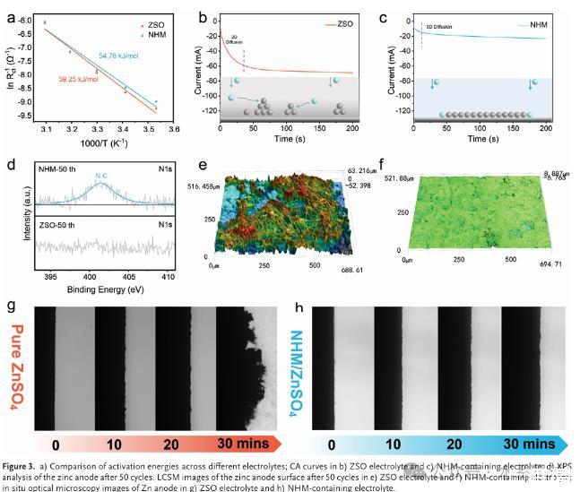 本研究探索了一種新型有機NHM添加劑,旨在增強陽極界面穩定性并改善鍍覆/剝離行為。通過降低界面張力,NHM添加劑重塑了電雙層(EDL),有效限制了鋅陽極與H?O之間的接觸,從而抑制了寄生反應。