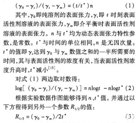 其中,即純?nèi)軇┑谋砻鎻埩Γ磘時(shí)刻表面活性劑溶液的表面張力,即介平衡時(shí)表面活性劑溶液的表面張力。n與t均為動態(tài)表面張力特性參數(shù),是常數(shù)。t與時(shí)間的單位相同,n是無因次量。t的值即達(dá)到。與7數(shù)值之和的一半所需要的時(shí)間,其與表面活性劑的濃度有關(guān),當(dāng)表面活性劑濃度升高時(shí),t減小。