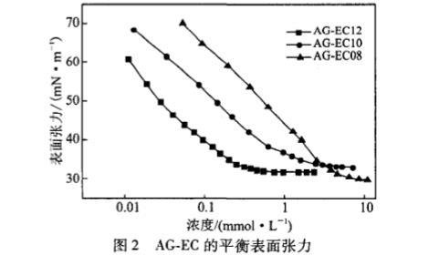 以去離子水為溶劑配制不同濃度的AG.EC溶液,靜置12 h后利用krussK12表面張力儀通過wilhelmy吊片法測定其平衡表面張力。控制溶液溫度(254-0.3)clC,測定前去離子水校準(zhǔn)表面張力儀至(72±0.3)mN/m。由表面張力()一濃度對數(shù)(1gc)圖,可得AG.EC在水中的臨界膠束濃度(cmc)以及cmc下的表面張力(一)。