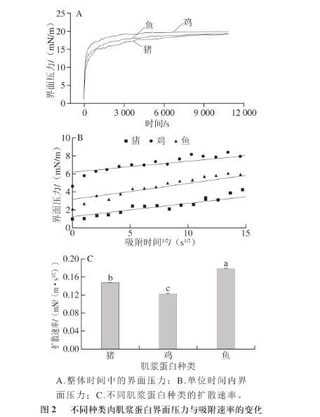 肌漿蛋白的吸附動力學實驗表明魚肉肌漿蛋白的擴散速率較豬肉和雞肉肌漿蛋白間顯著較大,這可能是由于大粒徑的肌漿蛋白產生的空間位阻在一定程度上削弱了表面疏水性的提高帶來的吸附速率的增加,但雞肉與豬肉肌漿蛋白之間的擴散速率卻無顯著性差異。