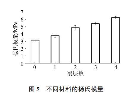 對羥基磷灰石和覆層材料的楊氏模量進行了測量,結果如圖5所示??瞻椎牧u基磷灰石材料的楊氏模量為3.14±0.16 MPa,隨著覆層層數的增加楊氏模量逐漸增加,最高可達6.21±0.18 MPa,說明膠原蛋白肽的覆層能夠有效地改善羥基磷灰石材料的力學性能,提高其楊氏模量。