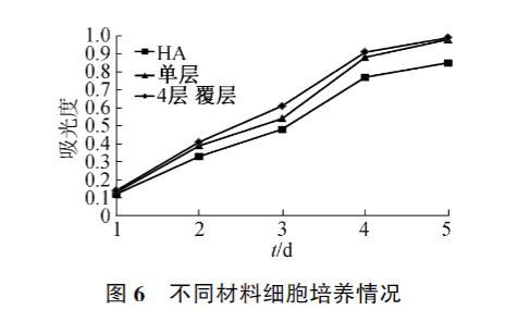 MC3T3-E1細胞在羥基磷灰石和覆層材料上培養5天的增殖情況見圖6。因結果類似,圖中僅列出了單層和4層覆層材料的增殖結果,可以看出在覆層材料上MC3T3-E1細胞增殖要優于空白羥基磷灰石材料,表明所制覆層材料不僅無細胞毒性,而且因膠原蛋白肽的優良生物相容性,能一定程度上促進細胞增殖。所用的羥基磷灰石和膠原蛋白肽都是經過實踐證明的生物相容性良好的材料,其對材料生物性能的提升作用是由其本身的生物相容性良好引起的,因此覆層層數對生物性能提升作用不明顯。