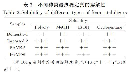 聚氨酯發(fā)泡過程中,各原料之間的相容性對(duì)泡沫的性能有重要影響。相容性好的原料可以確保發(fā)泡過程中的化學(xué)反應(yīng)順利且充分進(jìn)行,從而獲得均勻、細(xì)膩的泡沫結(jié)構(gòu),提高泡沫的物理性能和使用性能。表3是不同種類泡沫穩(wěn)定劑在不同溶劑中的溶解性測(cè)試,通過測(cè)試結(jié)果可知,經(jīng)過接枝改性后的PAVE-5和PGVF-6在多元醇和環(huán)戊烷中的溶解性較好,和國產(chǎn)-1、進(jìn)口-2等泡沫穩(wěn)定劑都能夠很好的溶解在多元醇和環(huán)戊烷中。PGVF-6和PAVE-5在多元醇中表現(xiàn)出的優(yōu)良溶解性主要得益于POSS接枝的APEG鏈段的醚鍵和羥基都具有明顯的極性,這使得其分子間以及與其他極性分子間可以形成較強(qiáng)的極性相互作用。這種相互作用有助于分子間的相容性,對(duì)聚氨酯泡沫的形成和性能有積極作用。