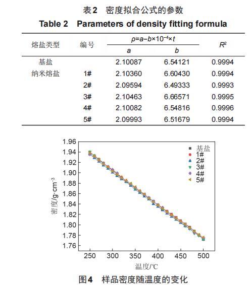 文獻(xiàn)中提出,在熔融鹽中加入SiO2納米顆粒后,由于分子間作用力和納米熔鹽配制過程中的攪拌作用,熔融鹽和納米顆粒在熔鹽體系中會形成一種納米云核。納米云核中納米顆粒被大量的熔融鹽包裹,此時SiO2納米顆粒的密度對納米云核的密度影響可以忽略不計,納米云核的密度始終與基鹽的密度保持一致。