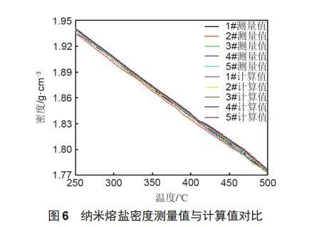 根據(jù)混合物密度計算公式對納米熔鹽的密度進(jìn)行計算后,與實(shí)驗(yàn)測量得到的密度進(jìn)行對比。