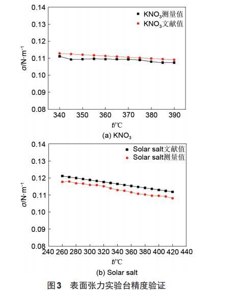 本實(shí)驗(yàn)先對NaNO3的表面張力進(jìn)行測量,得到儀器系數(shù)C。由式(4)可知,儀器系數(shù)C與溫度無關(guān),對NaNO3在5個溫度工況點(diǎn)下的表面張力進(jìn)行測量,并且每個溫度工況點(diǎn)采集3次測實(shí)驗(yàn)數(shù)據(jù),通過最終的計算得到本實(shí)驗(yàn)臺的儀器系數(shù)C=0.00053。對KNO和solar salt的表面張力進(jìn)行測量后,與文獻(xiàn)值進(jìn)行對比,如圖3所示。