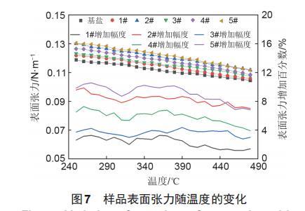 樣品的表面張力值隨溫度變化如圖7所示。可以看到,在250~480℃內,基鹽的表面張力在0.1044~0.1188N/m,表面張力隨溫度的升高呈下降趨勢。1#納米熔鹽的表面張力在0.1059~0.1219N/m,對數據進行擬合后,擬合系數在0.995以上,擬合程度較好。2#納米熔鹽的表面張力在0.1117~0.1301N/m,擬合系數為0.996,隨溫度變化的趨勢和基鹽及一般熔鹽表面張力的變化趨勢保持一致,均隨溫度的升高呈下降趨勢。3#和4#納米熔鹽的表面張力在0.1075~0.1232 N/m和0.1085~0.1265 N/m,擬合系數都在0.994以上,其中4#納米熔鹽的擬合系數與2#納米熔鹽的擬合系數相同,均為0.996,擬合程度最好。5#納米熔鹽的表面張力在0.1115~0.1305N/m,擬合系數為0.991。