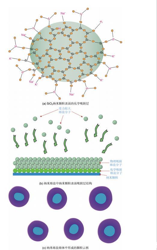 (4)采用高溫熔融法制備納米熔鹽時,由于SiO2納米顆粒表面缺少配位的原子,熔融鹽分子會在SiO2納米顆粒周圍先形成化學吸附層,隨后由于攪拌的作用,形成物理吸附層,最終以納米云核的形式存在于熔鹽體系中。