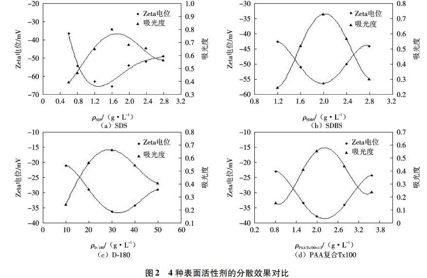 圖2為pH=7的條件下,CNFs(質量濃度0.05g/L)懸浮液的Zeta電位及吸光度隨表面活性劑濃度的變化情況.由于4種表面活性劑中,SDS與SDBS均為陰離子型表面活性劑,D-180、PAA和Tx100雖為高分子聚合物,但在分散過程中均可電離出陰離子,故懸浮液中CNFs表面的Zeta電位均為負值.從Zeta電位曲線來看,4種懸浮液的Zeta電位絕對值均隨表面活性劑濃度的增加而呈現先增大后減小的趨勢,期間出現明顯峰值.從吸光度曲線來看,4種懸浮液的吸光度曲線也隨表面活性劑濃度的增加而先增大后減小,同樣存在明顯的峰值.綜合分析2條曲線可以得出4種表面活性劑的最佳分散濃度:SDS的最佳分散濃度為1.6~g/L,SDBS的最佳分散濃度為2.0~g/L,D-180的最佳分散濃度為30 g/L,PAA復合Tx 100的最佳分散濃度為2.0~g/L.通過橫向對比4幅曲線圖,可以比較4種表面活性劑在各自最佳分散濃度下對CNFs的分散效果.SDS在最佳分散濃度下得到的CNFs懸浮液Zeta電位絕對值達到60 mV,吸光度達到0.80,均高于其他3種表面活性劑,說明SDS的分散性能最好,形成的CNFs懸浮液穩定性最高.SDBS的分散效果次之,在最佳分散濃度下,CNFs懸浮液的Zeta電位絕對值為56 mV,吸光度達到0.75.再次是D-180,在其最佳濃度下,懸浮液的Zeta電位絕對值為37 mV,吸光度為0.67.分散效果最差的為PAA復合Tx100,所得的CNFs懸浮液的Zeta電位絕對值為38mV,吸光度僅為0.55.