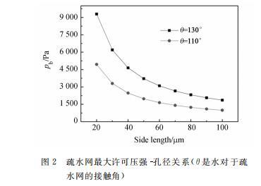 其中:sigma為液體表面張力,a為柵網方孔的邊長,theta為液體對于柵網的接觸角。計算中假設水溫為20^{circ}C,此時水的表面張力系數sigma=0.0728~N/m(后面計算中都采用此參數)。最大許可壓強Pb和孔邊長的關系如圖2所示,可以看到采用疏水性好、網孔小的柵網可以得到更大的Pb。