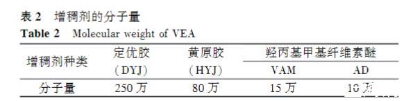 本工作采用多種增稠劑對砂漿的黏度進(jìn)行調(diào)整,分別為天然植物多糖類增稠劑(定優(yōu)膠和黃原膠)和合成纖維素醚類增稠劑(羥丙基甲基纖維素醚)兩大類,各自的分子量列于表2中。