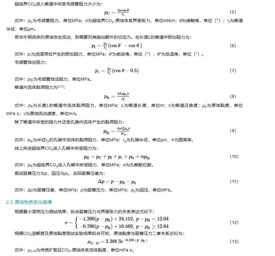 CO2進入孔喉時與原油的接觸時間較短,來不及進行擴散、溶解,此時原油和CO2的物理性質(zhì)尚未發(fā)生變化。超臨界CO2進入喉道中所受毛細(xì)管阻力是由超臨界CO2-原油界面張力、潤濕接觸角、孔喉半徑等參數(shù)共同引起: