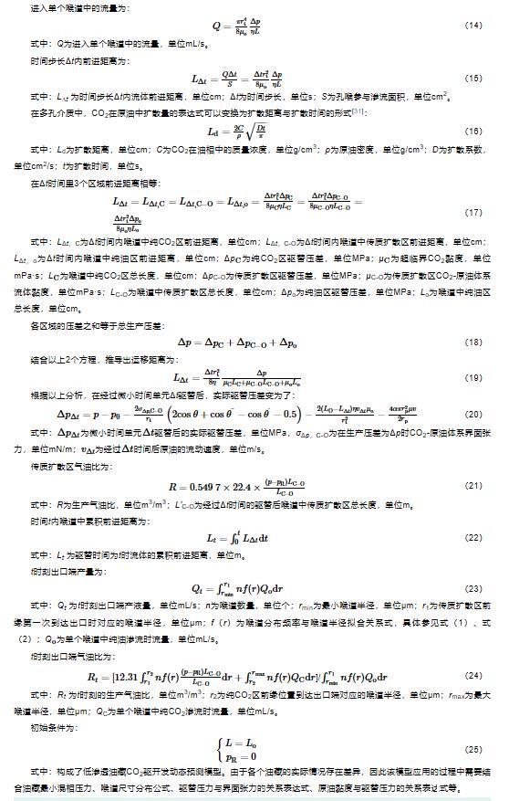 CO2驅(qū)能有效提高低滲透油藏采收率,但由于低滲透油藏普遍存在強非均質(zhì)性,導(dǎo)致CO2驅(qū)開發(fā)動態(tài)難以準(zhǔn)確預(yù)測。針對該問題,在綜合考慮喉道大小及分布、CO2溶解降黏和界面張力變化等因素的基礎(chǔ)上,結(jié)合CO2驅(qū)滲流力學(xué)理論,建立了基于時間節(jié)點的低滲透油藏CO2驅(qū)開發(fā)全過程動態(tài)預(yù)測模型。