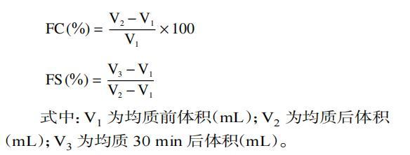式中:V1為均質前體積(mL);V2為均質后體積(mL);V3為均質30 min后體積(mL)。