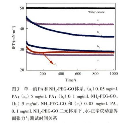 在25℃條件下,測(cè)得水和正辛烷之間的界面張力為50.7 mN/m(圖3),與之前研究中報(bào)道的界面張力值51.16 mN/m非常接近。為了研究PA與NH2-PEG-GO在共存時(shí)對(duì)界面張力的影響,分析了0.05 mg/mL PA、0.1 mg/mL NH2-PEG-GO各自對(duì)界面張力的影響。圖3顯示PA與NH2-PEG-GO均具有界面活性,能夠吸附到水-正辛烷界面上,降低界面張力。同時(shí)也觀察到:0.05 mg/mL PA降低界面張力速率快,平衡時(shí)間較短(<200 s),界面張力曲線呈現(xiàn)先快速下降后平衡的趨勢(shì),而當(dāng)0.1 mg/mL NH2-PEG-GO存在于溶液中時(shí),界面張力降低速率較慢,大約在700 s后達(dá)到平衡。分析發(fā)現(xiàn),界面張力隨著時(shí)間的演變呈現(xiàn)先快速下降,后緩慢下降,最后平衡的特點(diǎn),這表明接近吸附平衡時(shí)出現(xiàn)勢(shì)壘,減緩了粒子在界面上的進(jìn)一步吸附。這種吸附勢(shì)壘由多種因素導(dǎo)致,通常與已吸附在界面上的分子所產(chǎn)生的表面壓以及隨著界面密度提高,分子取向的改變相關(guān)。同時(shí)在吸附后期,可供吸附的界面面積減少,已經(jīng)吸附到界面上的粒子必須重新排列以空出足夠的空間供額外的粒子進(jìn)行吸附。這種重排的速率是由粒子的面內(nèi)遷移率決定的,即粒子在界面上的擴(kuò)散系數(shù)。該擴(kuò)散系數(shù)通常要小于粒子在本體中的擴(kuò)散系數(shù),并與粒子尺寸、粒子表面配體修飾等相關(guān)。