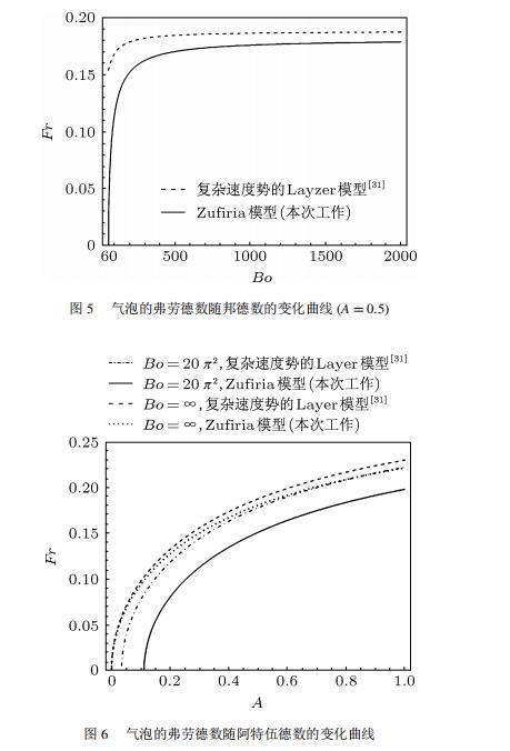 當(dāng)取邦德數(shù)一定時(shí),氣泡的弗勞德數(shù)隨阿特伍德數(shù)的變化如圖3所示。在圖3中Bo=20pi^2。從圖中可以發(fā)現(xiàn),利用Goncharov所提出的復(fù)雜速度勢(shì)運(yùn)算的結(jié)果比本次工作稍微大一些。在阿特伍德數(shù)等于1時(shí),兩種理論結(jié)果完全一致。當(dāng)阿特伍德數(shù)較小時(shí),兩種理論結(jié)果也基本一致。