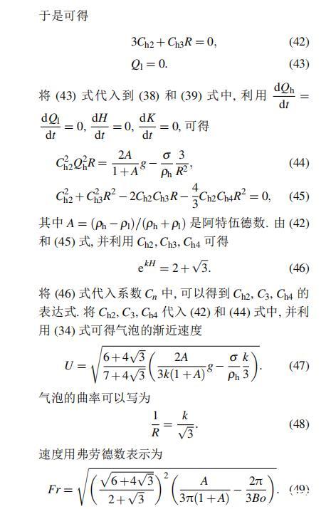 本文將簡(jiǎn)單速度勢(shì)的Layzer模型和Zufiria模型推廣至非理想流體,并利用兩種模型考慮了界面張力的影響。分別得出了利用簡(jiǎn)單速度勢(shì)的Layzer模型和Zufiria模型在考慮界面張力情況下Rayleigh-Taylor不穩(wěn)定性非線性演化后期氣泡的漸近解和曲率半徑的解析表達(dá)式。定量分析了模型之間的差別。結(jié)果表明:界面張力壓低了氣泡的漸近速度,但卻對(duì)氣泡的曲率沒有影響。在考慮界面張力的情況下,簡(jiǎn)單速度勢(shì)的Layzer模型比復(fù)雜速度勢(shì)的Layzer模型給出的漸近速度小,但在阿特伍德數(shù)趨于1時(shí),兩種模型的結(jié)果一致;Zufiria模型的結(jié)果始終小于Layzer模型。