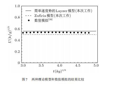 最后,我們將兩種理論模型的結(jié)果與數(shù)值模擬進(jìn)行了比較,如圖7所示。在誤差允許的范圍內(nèi),Zufiria模型和Layzer模型與數(shù)值模擬符合的都很好。由簡(jiǎn)單速度勢(shì)的Layzer模型得出的結(jié)果更接近于數(shù)值模擬。另外,從圖7中還可以看出,簡(jiǎn)單速度勢(shì)的Layzer模型計(jì)算值比數(shù)值模擬結(jié)果高,而Zufiria模型比數(shù)值模擬低。這可能由于Zufiria模型假設(shè)速度勢(shì)是復(fù)數(shù)勢(shì),會(huì)人為引進(jìn)速度的耗散,導(dǎo)致結(jié)果比數(shù)值模擬低,而Layzer模型的計(jì)算值略高于數(shù)值模擬的原因可能由于數(shù)值模擬沒有達(dá)到漸近速度。
