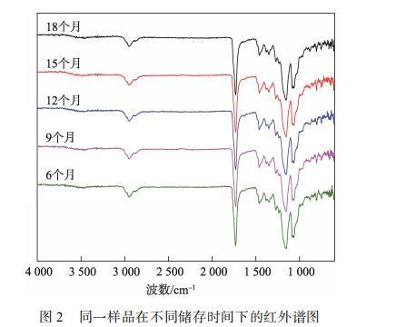 為了探究表面轉(zhuǎn)移涂層是否發(fā)生了結(jié)構(gòu)變化,對不同儲存時間下的樣品進行紅外光譜測試分析,見圖2。可以看出,儲存時間為6—18個月的樣品的紅外譜圖并未發(fā)生明顯變化。譜圖的一致性證明了噴鋁紙表面轉(zhuǎn)移涂層的基本結(jié)構(gòu)并未隨著時間發(fā)生明顯變化,即掉墨現(xiàn)象的出現(xiàn)并非由于轉(zhuǎn)移涂層出現(xiàn)結(jié)構(gòu)變化導(dǎo)致。根據(jù)相關(guān)研究,噴鋁紙在儲存的時候,紙張及涂層中添加的助劑,環(huán)境介質(zhì)中的水分子、油污和空氣等小分子物質(zhì)會通過吸附、擴散、遷移和凝集等作用,甚至鍵合等途徑,在轉(zhuǎn)移涂層表面形成低分子物質(zhì)的富集區(qū),即弱界面層,降低了轉(zhuǎn)移涂層的表面張力,并使其印刷適性變差。