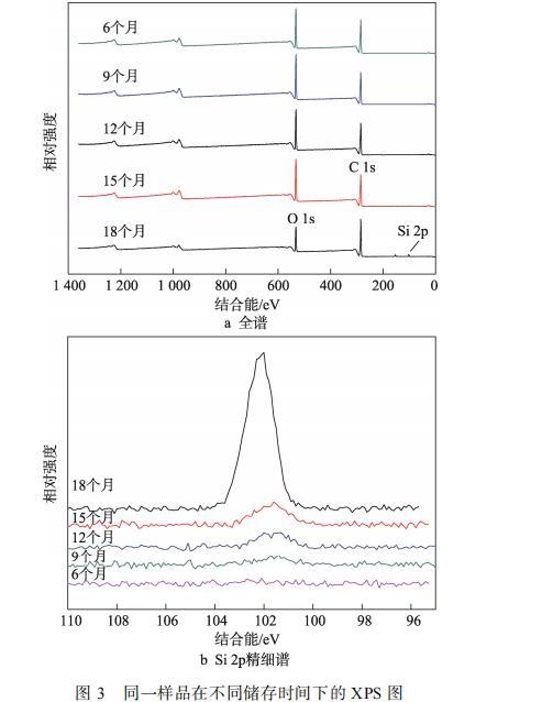 為了探究噴鋁紙表面析出的小分子物質(zhì)的成分,筆者通過XPS分析儲存時間為6個月、9個月、12個月、15個月、18個月紙張表面元素的變化,見圖3a。在XPS光譜圖中,可以觀察到C 1s,O 1s的特征峰,結(jié)合能分別為285.1、532.3 eV。第18個月紙張的XPS光譜圖中,出現(xiàn)了Si 2p的特征峰,結(jié)合能為102 eV。由圖3b和表4可知,6—15個月硅含量逐漸增加,元素原子數(shù)分數(shù)由0增至0.6%,但均未出現(xiàn)成型的峰。18個月的紙張表面硅原子數(shù)分數(shù)劇增為3.5%。這表明隨著儲存時間增加,紙張表面逐漸有含硅的無機小分子析出。此外,由表4也可看出,18個月的樣品表面C原子數(shù)分數(shù)明顯升高,從69.9%升至75.1%,O原子數(shù)分數(shù)則由29.5%降低至20.0%,證明硅主要以Si?C鍵的形式存在,析出的有機硅形成了低分子物質(zhì)弱界面層,降低了樣品涂層的表面張力。