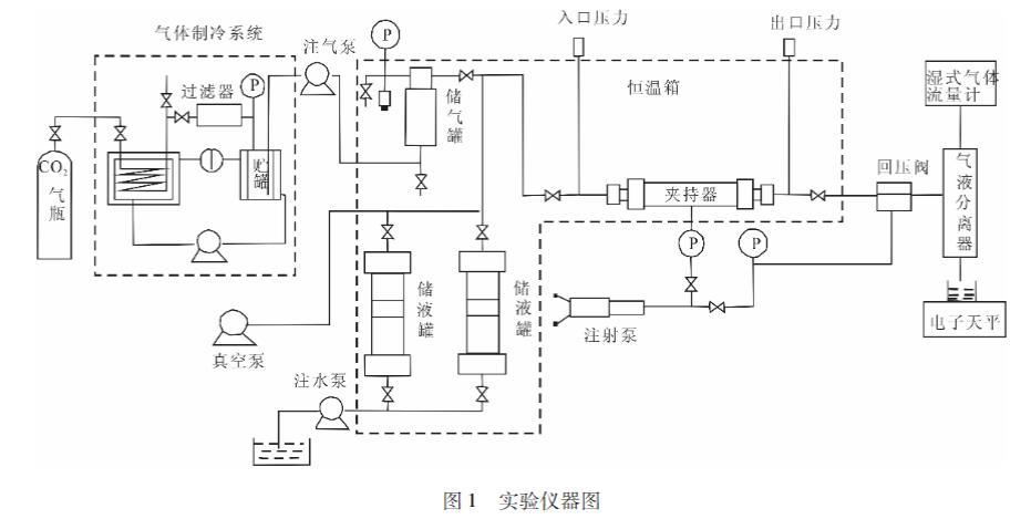 實驗所用裝置為地質封存條件下CO2遷移物模擬平臺,如圖1所示。主要結構分為以下幾個系統:氣體制冷系統、氣體注入驅替系統、液入驅替系統、回環壓系統、巖心夾持系統、量系統、抽真空系統及數據采集和微機測控系統等。CO2氣體經氣體制冷系統冷卻后通過注氣壓注入儲氣罐,最大注入壓力20MPa。液體現,通過注水泵恒流注入儲液罐,最大注入流量為9.9ml/min。通過注射泵設置回、環壓。儲氣罐和儲液罐通過出氣、出液閥門將CO2、液體括注入巖心夾持器。通過真空泵對巖心抽真空??诙说臍怏w、液體通過氣液分離器分離,氣體通過濕式氣體流量計記錄瞬時和累計流量,體通過電子天平稱重的方式記錄其瞬時和累g計流量。瞬時的入口、出口壓力通過計算機記秦玉錄。儲氣罐、儲液罐、巖心夾持器都放置于恒溫況箱內,通過恒溫箱控制其內部溫度,范圍為室溫至120℃。