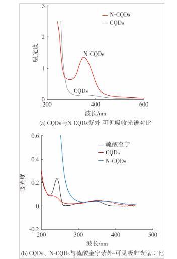 圖4(a)是CQDs與N-CQDs的紫外-可見吸收光譜。與CQDs的吸收光譜相比,N-CQDs在波長為350 nm處有一個明顯的吸收峰,這是酰胺基團中的C=O的n→π躍遷所致,在長波段方向出現(xiàn)吸收帶。這也表明氮原子已被成功引入碳量子點中。圖4(b)是以參比法計算熒光量子產率CQDs和N-CQDs以及硫酸奎寧的紫外吸收光譜對比,從圖4(b)可以看出,三者吸光度在波長為300~400 nm區(qū)間內基本接近,且數(shù)值上沒有超過0.05,滿足量子產率計算條件要求,可以此濃度為基礎計算熒光量子產率。