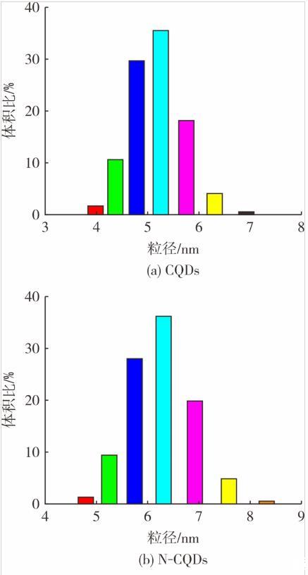 圖3是CQDs和N-CQDs的粒徑分布直方圖。由圖3可知,兩種碳量子點的粒徑分布都比較均勻,CQDs粒徑集中分布在(5.25±0.5)nm,N-CQDs粒徑集中分布在(6.31±0.5)nm,且都在10 nm以下,符合碳量子點的粒徑特征。此外,N-CQDs的粒徑整體略大于CQDs,可能是由于氮原子的摻雜打破了碳量子點的完整晶格結構,導致碳量子點發(fā)生晶格畸變和扭曲,進而影響形成的碳量子點的粒徑。