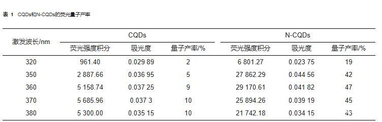 對圖5中不同激發(fā)波長下CQDs和N-CQDs的熒光發(fā)射光譜計算熒光積分強度后計算不同激發(fā)波長下的熒光量子產率(硫酸奎寧在313 nm激發(fā)波長下的熒光強度積分為22 860.61,吸光度為0.028 63),結果見表1。