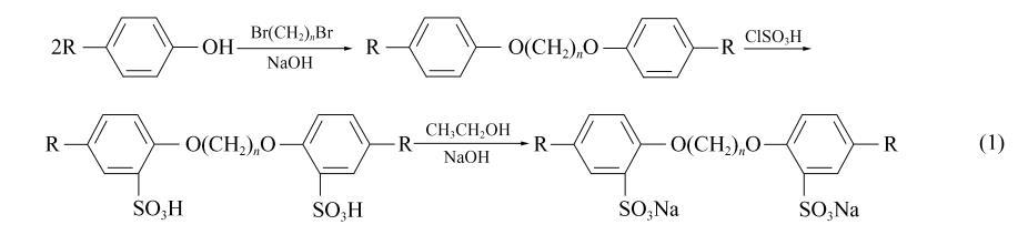 烏永兵等介紹的具有帶支鏈?zhǔn)杷幕撬猁}型雙子表面活性劑,其疏水基的支化度不高,且對聯(lián)結(jié)基的影響未有系統(tǒng)的闡述。筆者合成了一系列具有高支化度疏水基、不同聯(lián)結(jié)基長度的新型磺酸鹽型雙子表面活性劑 D2Cn (D為疏水基仲辛基,C為聯(lián)結(jié)基中的亞甲基, n為 2,4,6,8),研究了其水溶液的表面活性、界面活性及泡沫性能,討論了聯(lián)結(jié)基對其界面張力和起泡性能的影響。