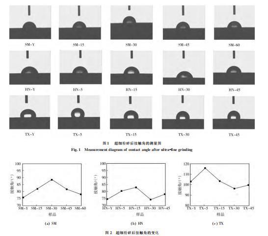 3種煤樣超細(xì)粉碎后的接觸角變化見(jiàn)圖1、2。可以看出,變質(zhì)程度高的太西煤的接觸角在100°左右波動(dòng),明顯大于神木不粘煤和淮南氣煤的接觸角(在75°左右變化)。還可以看出,濕法超細(xì)粉碎后3種變質(zhì)程度煤樣的接觸角的變化規(guī)律相似,在短時(shí)間的濕法超細(xì)粉碎后,接觸角變大,疏水性增強(qiáng),隨著超細(xì)粉碎時(shí)間的延長(zhǎng),接觸角減小。總體來(lái)看,神木煤與淮南煤在濕法超細(xì)粉碎后的接觸角大于超細(xì)粉碎前的,說(shuō)明對(duì)于低階煤,在濕法超細(xì)粉碎后,煤顆粒表面的疏水性在一定程度上有所增強(qiáng),潤(rùn)濕性減弱;太西煤在濕法粉磨30、45min后的接觸角小于超細(xì)粉碎前的,由此可得,對(duì)于高階煤,長(zhǎng)時(shí)間進(jìn)行濕法超細(xì)磨礦會(huì)劣化煤顆粒表面的疏水性。