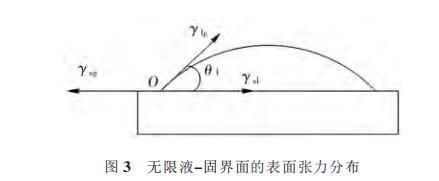 朱定一等通過(guò)設(shè)計(jì)一種在有限液-固界面上的潤(rùn)濕性表征體系,推導(dǎo)出在無(wú)限液-固界面系統(tǒng)中固相表面張力和液-固界面張力的計(jì)算方法,并且通過(guò)潤(rùn)濕角實(shí)驗(yàn)和計(jì)算,證實(shí)了在接觸角較大時(shí),該理論對(duì)固相表面張力的一致性。圖3所示為液相在無(wú)限固體平面上的潤(rùn)濕表征系統(tǒng)。其中γsl、γlg、γsg分別表示固-液、液-氣、固-氣3個(gè)界面上的表面張力,O為氣-液-固三相接觸點(diǎn),θ1為氣-液界面的切線與固-液界面的夾角,即接觸角。當(dāng)達(dá)到平衡時(shí),作用于潤(rùn)濕周邊的3個(gè)表面張力在水平方向的分力必為0,此時(shí)的平衡狀態(tài)方程,即Young方程為