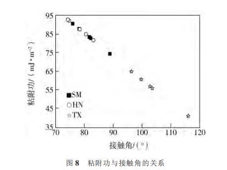 將接觸角θ與γlg代入式(9)可得煤顆粒與水的粘附功,結(jié)果見(jiàn)圖7。由圖可知,隨著超細(xì)粉碎時(shí)間的延長(zhǎng),煤-水體系的粘附功的變化趨勢(shì)與接觸角的變化趨勢(shì)相反。3種煤樣的接觸角與粘附功的關(guān)系見(jiàn)圖8。由圖可知,隨著接觸角的增大,煤-水界面的粘附功減小,說(shuō)明粘附功越小,煤顆粒的潤(rùn)濕性越差。粘附功也可作為衡量煤顆粒潤(rùn)濕性的指標(biāo)。