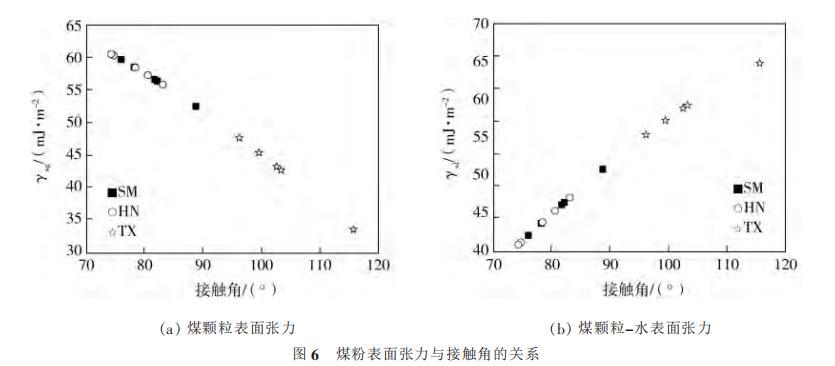 2)隨著變質(zhì)程度的增加,煤顆粒的表面張力減小;隨著煤顆粒粒度的減小,不同變質(zhì)程度煤樣的表面張力與接觸角呈負(fù)相關(guān),煤-水界面張力與接觸角呈正相關(guān);接觸角增大,煤顆粒表面張力減小,煤-水界面張力增大。