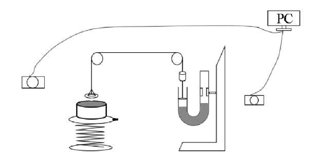 圖4為該實驗裝置設計圖。該定量實驗材料有U型管、砝碼(與金屬吊環一樣重)、活塞(與U型管內徑相吻合且質量極小)、定滑輪、升降臺和水槽、兩個數碼相機。其中一個相機用于錄像U型管示數變化,另一個相機用于觀察吊環形成水膜的狀態。最終兩個相機的圖像傳輸至PC端便可準確讀出水膜在對應狀態下U型管液面高度的示數。