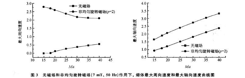 圖3 無磁場和非均勻旋轉磁場(7 mT、50 Hz)作用下,熔體最大周向速度和最大軸向速度曲線圖