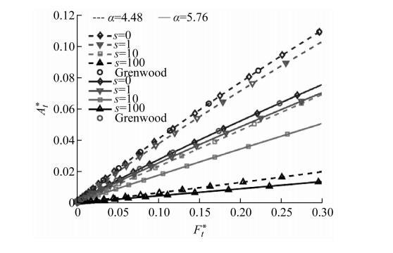 無量綱真實接觸面積At*與無量綱兩表面平均距離u的關(guān)系:兩表面間平均距離越大,真實接觸面積越小,且二者呈非線性關(guān)系。當兩表面間平均距離不變時,表面張力越大,真實接觸面積越小,這是由于表面張力的作用引起的。同理,當忽略表面張力時(s=0),其結(jié)果與Greenwood所得結(jié)果吻合。此外,當表面張力相同時,表面粗糙度較大時,真實接觸面積較小。這里由于選取的兩組表面形貌參數(shù)所對應的粗糙度相差不大,所以真實接觸面積的差別很小。