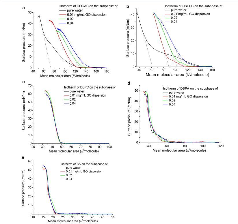 圖 1. 空氣-水或 GO 分散界面處脂質的表面壓力-面積等溫線:(a) 帶正電荷的 DODAB; (b) 積極 收費 DSEPC; (c) 帶中性電荷的 DSPC; (d) 帶負電的 DSPA; (e) 帶負電的 SA。 請注意,沒有表面壓力 在空氣-GO 分散界面處檢測到,而沒有在界面處擴散脂質。 每個分子軸面積的虛線的截距 表示每個分子的極限面積。