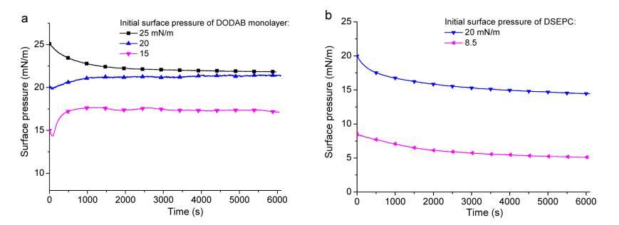 圖 4. GO 在不同表面的 (a) DODAB 和 (b) DSEPC 單層的吸附研究(表面壓力與經過時間) 壓力。 單層首先在純水亞相上壓縮到一定的表面壓力,然后 600 μL 1 mg/mL GO 分散體 被小心地緩慢注入單層下方的水亞相中。
