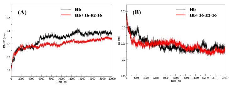 進一步研究16-E2-16的結構穩定性影響 結合Hb,采用分子動力學模擬。 我們分析了兩者的動態結構特性,例如均方根偏差 (RMSD) 和回轉半徑 (Rg)。 未綁定和 16-E2-16 有界 Hb 使用從獲得的軌跡 MD模擬。