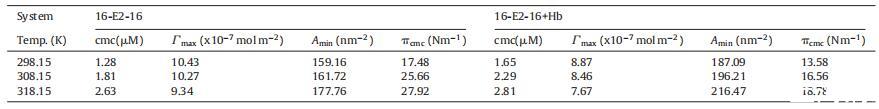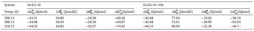 表 2 膠束化的自由能 (αG0m)、熵 (αS0m) 和焓 (αH0m) 的變化以及自由能 (αG0) 的變化 ad) 不存在和存在時 16-E2-16 的吸附 不同溫度下的 Hb。