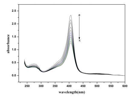 圖 2. 不存在和存在 16-E2-16 時 Hb (5 μM) 的紫外-可見光譜。 這 16-E2-16 (am) 的濃度為 0, 0.39, 0.76, 1.13, 1.48, 1.81, 2.14, 2.45, 2.75, 3.05 和 3.33 μM。