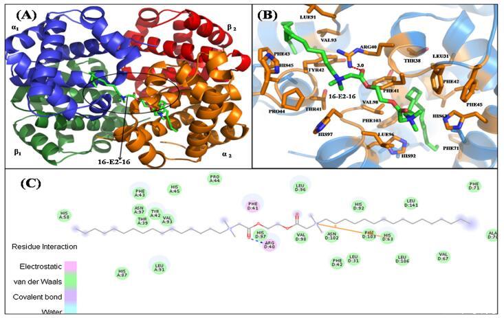 圖 6. 具有 16-E2-16 的 Hb 結構示意圖。 (A) Hb-16-E2-16 的結構。 Hb 的亞單位用不同的顏色表示。 配體 16-E2-16 是 以棍子為代表。 (B) 距停靠的 16-E2-16(綠色)5? 范圍內 Hb 的周圍氨基酸殘基(橙色)。 (C) Hb/16-E2-16 相互作用的二維表示。 (為了 對圖例中顏色參考的解釋,讀者可參考本文的網絡版本。)