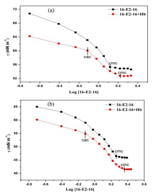 表面張力測量用于研究 關于 16-E2-16/Hb 相互作用的定性信息 空氣/水界面。 圖 1 顯示了 16-E2-16 分布的表面張力與對數濃度在不存在和 在不同溫度下存在 Hb (5 μM)。 斷點 表面張力與表面活性劑濃度對數的關系 不同溫度下純表面活性劑的文件對應 到相應溫度下表面活性劑的 cmc。 這 16-E2-16/Hb體系的表面張力曲線呈現兩個斷裂 點,第一個斷點對應臨界聚合 濃度(cac)代表表面活性劑的開始 蛋白質結合而作為第二個斷點對應于 在 Hb 存在下 16-E2-16 的 cmc。 16-E2-16 的 cmc 在不同溫度下不存在和存在 Hb 的情況下 列在表 1 中。從這些值可以看出,16-E2-16 的 cmc 隨著 Hb 的存在和溫度升高而增加。 在 Hb 存在下 cmc 的增加證實了 16-E2-16/Hb 復合物的形成,在此期間一些單體 與 Hb 結合,因此無法形成膠束 進而導致膠束化延遲 [54]。 表1還 表明 cmc 值隨溫度升高而增加 這意味著疏水力的參與,它們是 溫度依賴,在 cmc 的蛋白質表面活性劑相互作用中。 這可以歸因于 16-E2-的溶解度增加 16 單體隨溫度變化而抑制膠束化。 此外,較高的溫度有利于熱運動,這會導致 更多的分子與 Hb 結合。 但是,cac 保持不變 在所有溫度下。 因此,我們可以認為 16-E2-16 與 Hb 結合 通過 cac 附近的靜電相互作用,因為靜電 相互作用不受溫度影響。 此后,作為 表面活性劑濃度增加,蛋白質通過疏水力與表面活性劑相互作用。 下表面張力值 Hb-16-E2-16系統比對應的16-E2-16系統是 由于 Hb 的高表面活性。