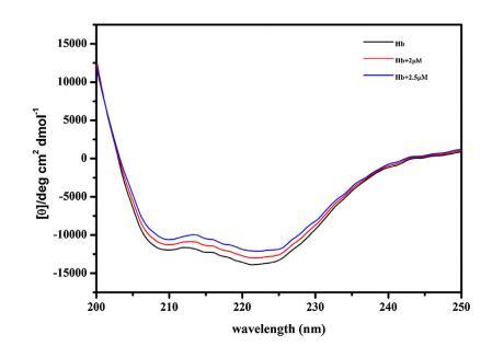 圖 5. 不存在和存在 16-E2-16 時 Hb (5 μM) 的 CD 光譜。