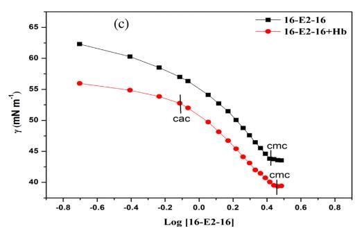 圖 1. 16-E2-16/Hb 在不同溫度下的表面張力。 (a) 298.15K (b) 308.15K (c) 318.15K。 [Hb] = 5 μM。