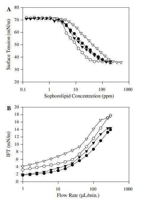 槐脂(SLs)相對(duì)較大的生產(chǎn)能力、可再生性和“生態(tài)友好性”有助于提高其作為家庭和個(gè)人護(hù)理產(chǎn)品中某些石化表面活性劑的添加劑或替代品的工業(yè)意義。 然而,為了考慮用于工業(yè)用途,SLs也必須廉價(jià)生產(chǎn),并且必須了解和控制其物理性質(zhì),以便準(zhǔn)確預(yù)測(cè)SLs在各種應(yīng)用中的潛力。 表面張力(ST)、臨界膠束濃度(CMC)、界面張力(IFT)和水溶性是表面活性劑應(yīng)用特別關(guān)注的四個(gè)性質(zhì)。 理想情況下,良好的表面活性劑是水溶性的,表現(xiàn)出較低的CMC,并導(dǎo)致最小表面張力(min.ST)小于30 mN/m。 這些性質(zhì)中的每一種都可以根據(jù)表面活性劑的化學(xué)組成進(jìn)行控制。 通過(guò)在多種不同的混合基質(zhì)(包括葡萄糖和4種不同的脂肪酸)上生長(zhǎng)棉鈴蟲(chóng),我們產(chǎn)生了具有不同化學(xué)分布的SLs。 簡(jiǎn)單地通過(guò)改變脂肪酸來(lái)生產(chǎn)不同的SLs的能力提供了在發(fā)酵水平上管理物理性質(zhì)的前景,并通過(guò)在應(yīng)用水平上以不同的比例混合SLs。